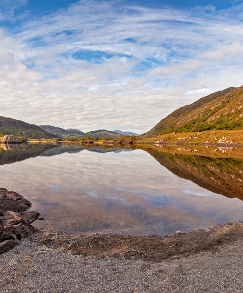 Set between the MacGillycuddy’s Reeks and the Purple Mountains, this stunning 11 km journey meanders through a breath-taking mountain pass, revealing wide lakes, time-worn stone bridges, rushing waterfalls and gentle hillsides scattered with sheep.